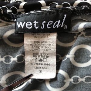Wet Seal halter top. Color black and white with chain geometric print. Raw hem detail. Tie neck and mid back. Two small holes where a safety pin was used at bust. Otherwise great condition.