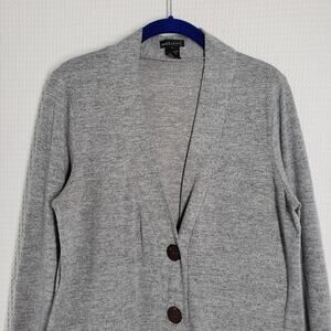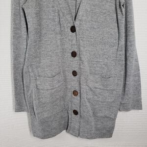 Wet Seal Women's Long Button-Up Cardigan Sweater. Gray lightweight V-neck long-sleeve stretch-knit cardigan with large brown faux coconut buttons and front pockets.