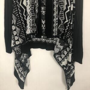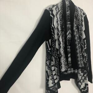 Open front tribal print cardigan in black/white. Contrasting sleeves. In good used condition. No stains, tears or holes.