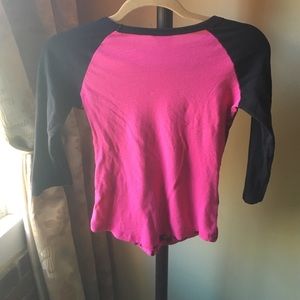 Super cute pink and black baseball t-shirt from Wet Seal. 3/4 length sleeve, retro pinup collage printed on front. Worn once. Size small. #wetseal #pink #black #baseballtshirt #3/4sleeve #sizesmall