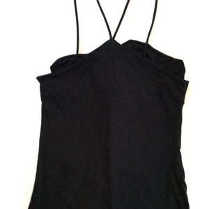 Cute top with asymmetrical straps and ruffles down the front and neckline. Black stretchy fabric and in perfect condition