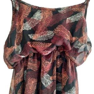 Art 2 Wear Colorful Summer Work Casual Party Beach---Add a pop of color to your wardrobe with this beautiful Wet Seal blouse. The multicolor pattern features a peach and rust/black color scheme, perfect for a summer or spring outfit. The sleeveless design and scoop neck create a flirty and comfortable fit, while the pullover closure makes it easy to wear. This vintage piece is machine washable and ideal for travel or casual occasions. The blouse is available in a women's size MED, and its theme includes Western, flower, beach, sexy, colorful, Hawaiian, tropical, and retro. Perfect for any fashion-forward woman, this Wet Seal blouse is a must-have for your wardrobe.