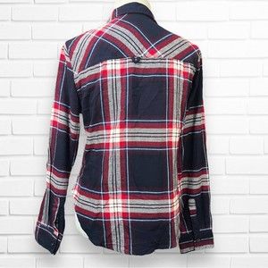 The Polly and Esther for Wet Seal flannel top with a button front features a classic red, white, and blue plaid pattern, making it a stylish and versatile addition to your wardrobe. Made with soft and comfortable fabric, this long-sleeve top is perfect for cooler days or layering during the colder seasons. The button front adds a touch of sophistication, while the relaxed fit ensures a comfortable and flattering silhouette. Pair it with jeans and boots for a casual yet trendy look, or dress it up with a skirt and heels for a more polished ensemble. Whether you're going for a relaxed or put-together vibe, this flannel top is a must-have for any fashion-conscious individual.