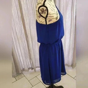 This darling royal blue dress from wet seal features a one shoulder design with elastic waistline. Junior size XL, this dress is in good pre-owned condition and shows minimal signs of wear. Original belt not included.