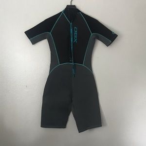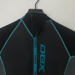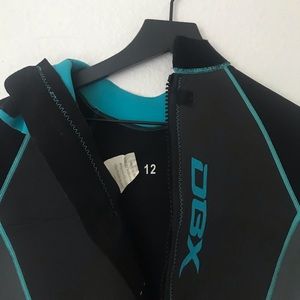 Black and grey wetsuit with blue lines. In great condition just too big on me. Works great and keeps you warm in the water.