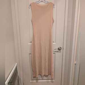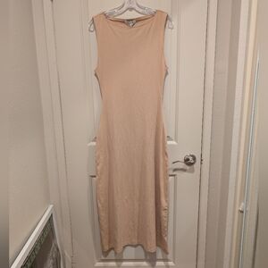 This elegant tan sleeveless dress is perfect for any occasion. Its simple yet sophisticated design offers a timeless look. Ideal for both casual and formal settings.