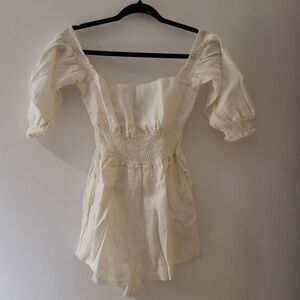 Elevate your summer wardrobe with the We Wore What Smocked Linen Romper Jumpsuit in a solid white linen fabric. This jumpsuit effortlessly combines style and comfort, making it an ideal choice for various occasions. It's perfect blend of fashion and comfort, this romper promises to enhance your summer wardrobe