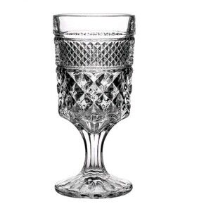 The Wexford By Anchor Hocking stemmed water goblet glass is a vintage collectible from the 1960s, made in the United States. This elegant goblet stands at 6 inches tall and is a classic piece of Mid-Century design. With its intricate detailing and timeless appeal, this vintage goblet is a perfect addition to any collection or as a unique decorative piece for any home.