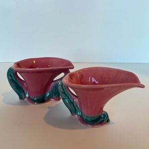A unique and beautiful Rose-pink colored pottery Sugar Bowl and Creamer in the shape of Lily flowers. Handles are in the shape of vines and are painted green. H 3in x L 4.75in x W 3.5in. Very Good condition with only a small chip on the underside base of the creamer. Does not compromise beauty or function of item. Zoom in on photos. A great set for the collector!