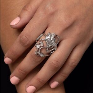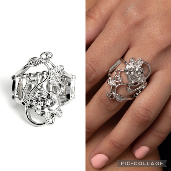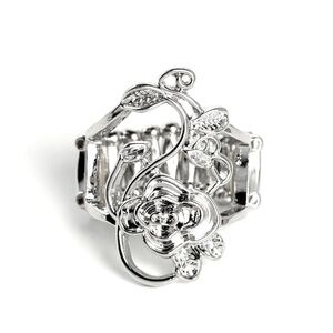 Detail ~ An elongated silver frame featuring sleek, silver vines that wind and curl up and around a high-sheen silver rose creates a stunning airy backdrop, allowing the skin to peek through the floral display for a whimsical finish. Features a stretchy band for a flexible fit.
