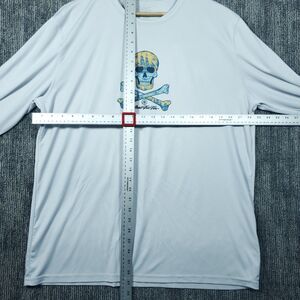 The What The Fin Performance Long Sleeve Skull Graphic Fishing Shirt in size XL is a stylish and comfortable shirt for any man who loves fishing or the outdoors. Made from lightweight and breathable polyester material, this shirt features a solid blue color with a round neck and long sleeves. The shirt is adorned with a logo accent and a graphic print of a skull, making it perfect for those who appreciate nature, nautical themes, and marine wildlife.