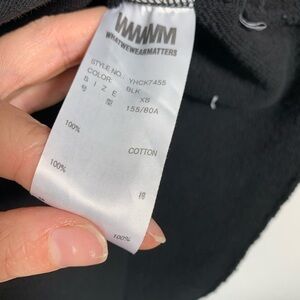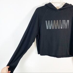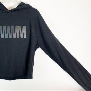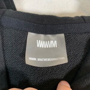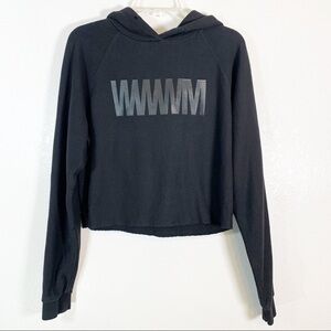 WWWM... What We Wear Matters black cropped style hoodie size XS. This is a very very high end Brand Sweat shirt that is very very comfortable and made for a relaxed Y2K style cropped fit. The drawstring is missing, but very easy to replace.