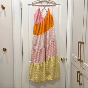 NWT! Perfect dress for summer! Embrace vibrant style with this colorful striped maxi dress. Perfect for any occasion, this dress features a blend of orange, pink, and yellow hues. Enjoy a comfortable fit and eye-catching design.