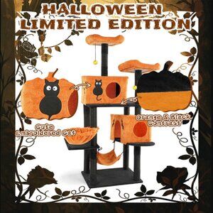 Transform your home into a feline paradise with this enchanting Halloween-themed cat tree that perfectly balances spooky charm with everyday functionality. Standing tall at over 5 feet, this impressive multi-level playground features a stunning black and pumpkin-orange color palette that captures the essence of Halloween while providing year-round gothic elegance.Your cats will be spoiled for choice with multiple luxury accommodations: two spacious hideaway condos adorned with adorable black cat silhouettes, two plush hammocks for peaceful afternoon naps, and two cushioned perches offering premium views of their kingdom. The sisal-wrapped scratching posts throughout each level ensure healthy claw maintenance while protecting your furniture.Safety meets style with this thoughtfully engineered design. Constructed from premium MDF boards with an extra-wide stabilizing base, this tower can confidently support multiple cats or larger breeds. The included anti-tip safety kit provides additional peace of mind for active households.Interactive elements like dangling toys keep your cats entertained for hours, while the varied textures and climbing opportunities satisfy their natural instincts to explore, scratch, and perch. Whether you're celebrating Halloween or simply love the striking aesthetic, this cat tree serves as both functional pet furniture and eye-catching home décor.Assembly is straightforward with included hardware and clear instructions, so your cats can begin enjoying