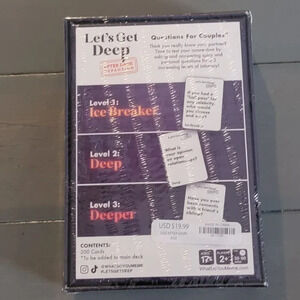 How to Play: Shuffle this expansion pack into your main Let's Get Deep deck for surprise spice throughout the night. Take turns asking and answering questions from various levels of intimacy: Ice Breaker, Deep, and Deeper. If you're in the mood for something strictly risqué, you can even create your own mini-deck using just the cards from this expansion pack. Same rules apply.