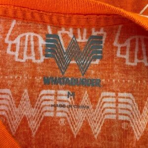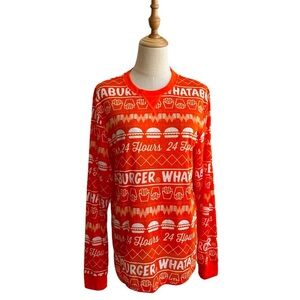 Whataburger Orange White French Fries 🍟 Burgers 🍔 Long Sleeve Tee Shirt Size Medium in excellent like new condition. No tags but never worn. This long sleeve tee has pullover styling, is lightweight and has a ribbed round neck and ribbed cuffs. It features a pattern of Whataburger logos, burgers, fries, and the text "24 Hours”. Measurements lying flat are approximately 19” inches underarm to underarm and from shoulder to hem approximately 27” inches. Perfect for the Whataburger 🍔 lover in your life.