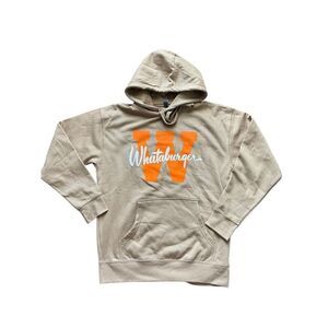 Whataburger, Branded Hoodie, Tan Sweatshirt, Fast Food Merch, Texas Style, Streetwear, Pullover Hoodie, Logo Hoodie, Cotton Blend, Unisex Hoodie, Size Large Hoodie, Soft Hoodie, Casual Wear, Vintage-Inspired, Iconic Brand, Graphic Sweatshirt