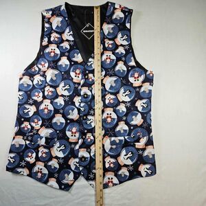 Festive Whatlees ugly Christmas vest in mens size XXL, made of soft polyester with a cheerful holiday design featuring snowglobes, Santa, penguins, bears, and snowflakes. Includes two shallow front pockets and an adjustable tie buckle on the back for a perfect fit. A fun and eye-catching choice for holiday parties or themed events! Excellent condition with no stains, holes, smells, or missing buttons.