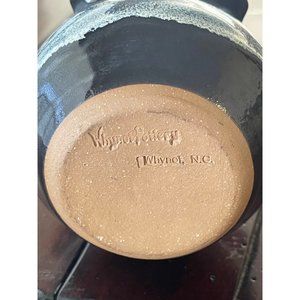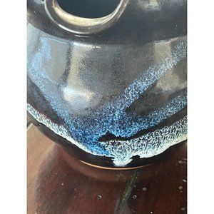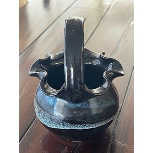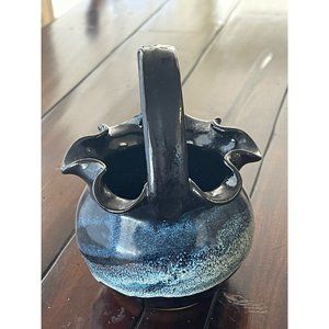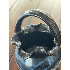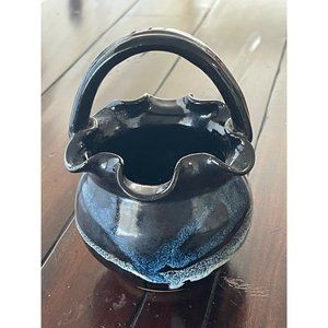 This offer is for a new beautifully crafted art pottery basket. This basket is highly ruffled at the rim of the basket. The body of the basket is navy to black with white cascading down the sides.