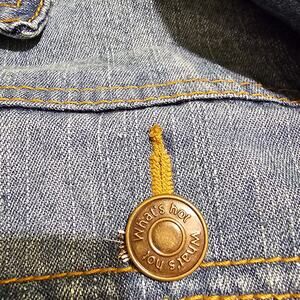 Unique and eye-catching What’s Hot denim jacket in women’s size 2X, featuring a custom embroidered floral back panel in shimmering peach and gold tones with metallic studs and crystal embellishments. Classic button-front design with four functional pockets, and bronze-tone buttons engraved with “What’s Hot.”