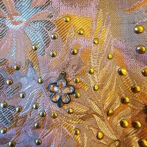 * Embellished back panel: gold floral brocade with metal studs & crystal charm