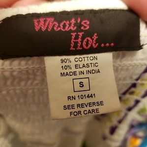 White with multi-colored design, midi, sleeveless dress with sweetheart neckline. Cotton/elastic blend. Excellent used condition.