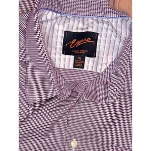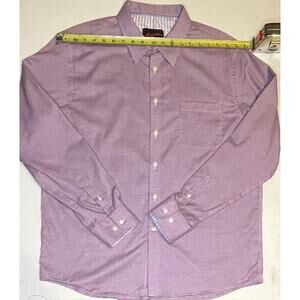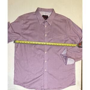 Very gently worn men’s slim fit, non-iron button-down shirt in a bold maroon/purple houndstooth pattern. Long sleeves, button front, and chest pocket. Tag size XL.