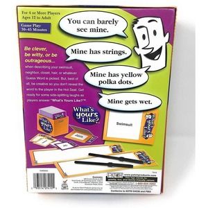 Be clever, be witty, or be outrageous when describing your swimsuit, neighbor, closet, hair, or whatever Guess Word is picked. But, best of all, be creative so you don’t reveal the word to the player in the Hot Seat. Get ready for some side-splitting laughs as players answer What’s Yours Like?