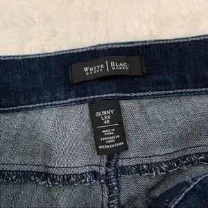 Like new. Skinny jeans with motocross-inspired seaming and stitching. Hematite crystals add an urban edge to the front and back pockets. Our straight fit. Straight through the hip and thigh, and sits lower on the waist. Dark wash. Lightly faded thighs and seat. Front pockets with welt detail. Rhinestone rivets throughout. Front zip with silvertone shank closure. Inside waistband inscribed with "Feel beautiful".