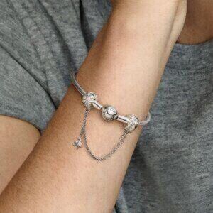 This sterling silver safety chain will secure and complete your bracelet styling with its abundance of beautifully crafted grains and an extra dangling chain.