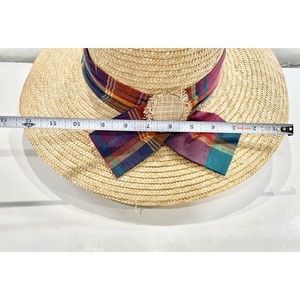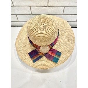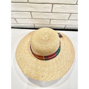 Wheat Natural Panama hat wide brim Straw large summer sun Rainbow Ribbon Accent. Excellent Preowned Condition M-1