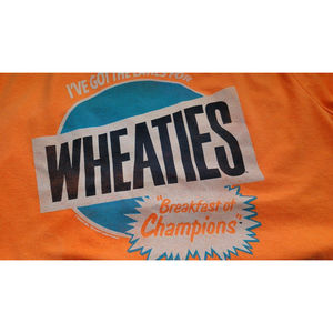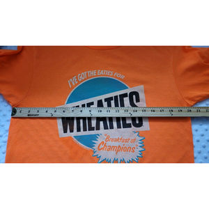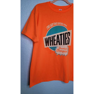 Pretty cool vintage promo Wheaties shirt. This is bright orange and is a size medium. The graphics have some cracking but I don't see any other issues.