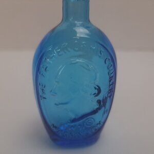 This vintage Wheaton blue glass bottle features a detailed embossed design of George Washington with the inscription "Father Of His Country." Collectible, vibrant, and historically inspired.