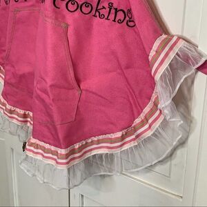 Adorable Apron that is perfect for a bride or newly wed. When I said I do, I didn’t mean the cooking printed on the front. Pink with white Ruffle tulle around the bottom. Bride embroidered above. Loop neck and tie waist. New without tags. Never used. Perfect condition. 100% cotton.
