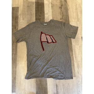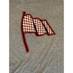 Soft heathered gray short sleeve shirt with unique red, white, and black houndstooth flag graphic on the front