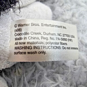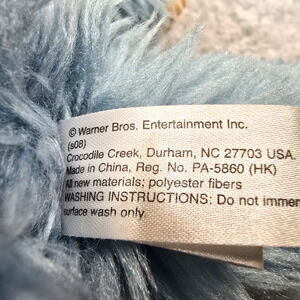 Both plush were officially licensed by Warner Bros. Entertainment Inc. The tags read (c) Warner Bros. Entertainment Inc. (s08) Crocodile Creek, Durham, NC 27703 USA. All new materials: polyester fibers.