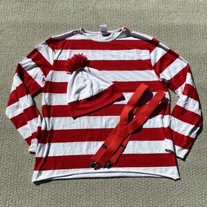 Where's Waldo Costume Adult Spirit Halloween Shirt Hat Glasses Suspenders L/XL