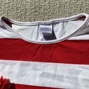 Dive into the fun of Halloween or your next costume party with this complete Where's Waldo costume! ADULT LARGE/X-LARGE. This spirited ensemble instantly transforms you into the iconic character, bringing a sense of playful adventure wherever you go. The set includes the signature red and white striped long-sleeved shirt, a matching bobble hat, and red suspenders, ensuring you have everything you need for a recognizable and comfortable costume. Perfect for Halloween parties, themed events, or even a fun run, this Where's Waldo costume is ready for any adventure.