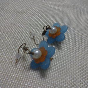 Whimsical "BLUE & ORANGE LUCITE FLOWER" Handmade Bronze Dangle Earrings #85B