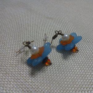 Whimsical "BLUE & ORANGE LUCITE FLOWER with PEARLS" Handmade Dangle Earrings 97B