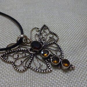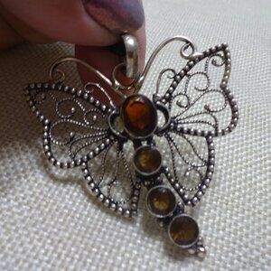 Whimsical BUTTERFLY with AMBER & CITRINE Handmade Silver Pendant/Cord #241C