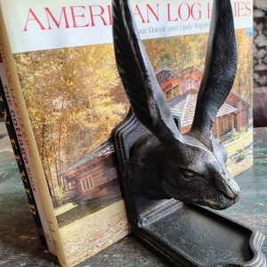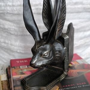 Unusual cast iron rabbit head bookends. 8.75" tall. They are a dark charcoal metal color. A playful addition to any bookshelf. Would look great on kitchen counter holding cookbooks or even cutting boards. Set of 2.
