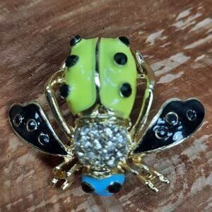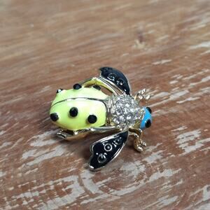 Whimsical Bumble Bee Pin Brooch. Gold tone base with yellow, blue, and black enamel. Has clear and black rhinestone accents. Measures approximately 1 1/8" long x 1 7/16" wide at wings. Pin mechanism works perfectly.