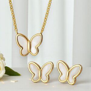 butterfly jewelry | 18k gold plated set | mother of pearl necklace | dainty earrings | romantic jewelry | feminine accessories | hypoallergenic jewelry | tarnish resistant | gold butterfly necklace | whimsical set | cute gift for her | bridal jewelry | anniversary gift | everyday elegance | trending butterfly jewelry | delicate set