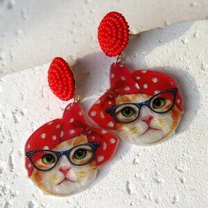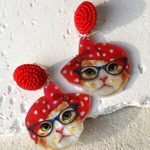 FUNNY FUN Whimsical Cat Face Acrylic Resin Drop & Dangle Earrings with Red Beaded Studs