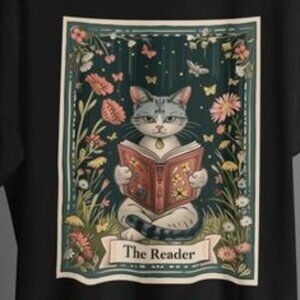 Whimsical Cat Tarot T-Shirt, The Reader Cat Card Design Wildflowers Cute Cat Tee