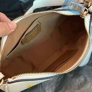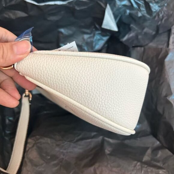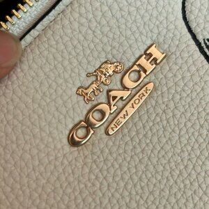 Infuse your look with whimsy using this Coach crossbody-style bag, showcasing Snoopy and Woodstock. The off-white pebbled leather construction offers durability and a luxurious feel, complemented by gleaming gold-tone hardware. It’s versatile design allows for easy carrying, providing both aesthetic appeal and practical functionality for busy days.