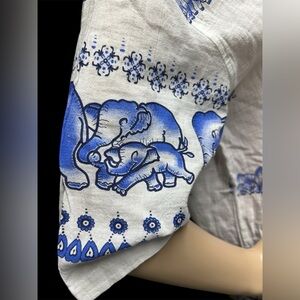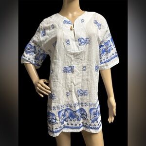 Amazing loose fit tunic in a very lightweight cotton by DA Collection. This all over novelty print elephant tunic is in excellent condition! No flaws. Beautiful indigo blue print on white. Split neck with wooden toggle closure.See extra details below including flat lay measurements before purchase!