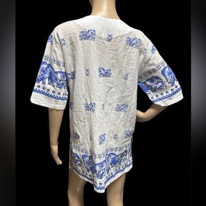 Amazing loose fit tunic in a very lightweight cotton by DA Collection. This all over novelty print elephant tunic is in excellent condition! No flaws. Beautiful indigo blue print on white. Split neck with wooden toggle closure.See extra details below including flat lay measurements before purchase!