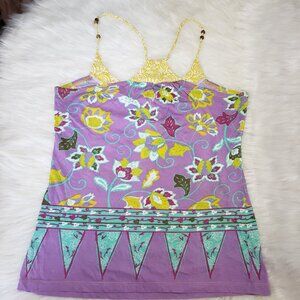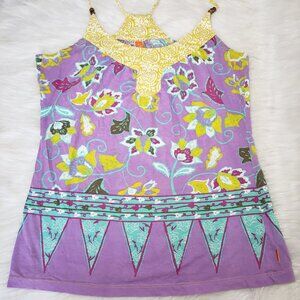 Whimsical Fairy Boho Multicolor Paisley floral strappy tank top wood bead racerback details Size Small